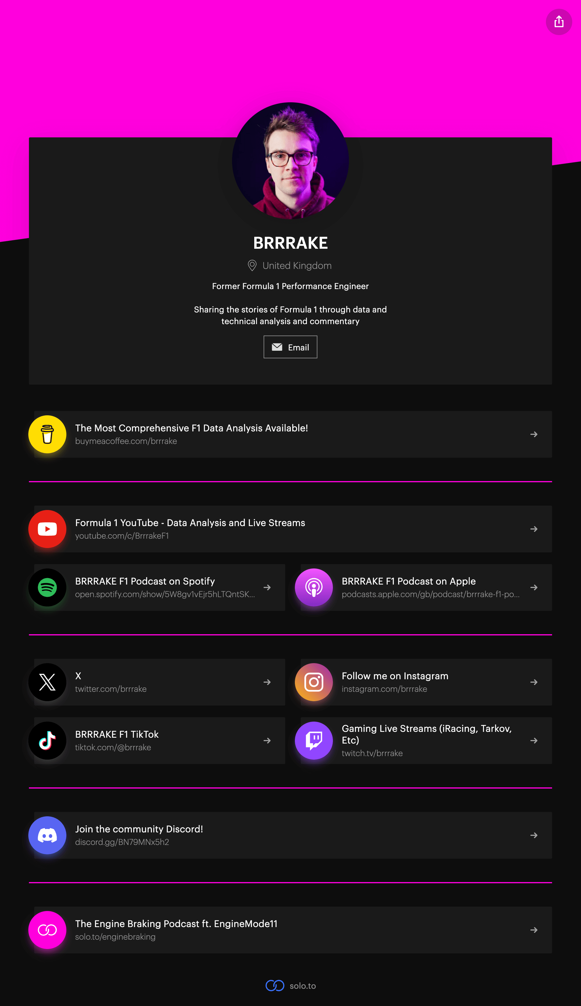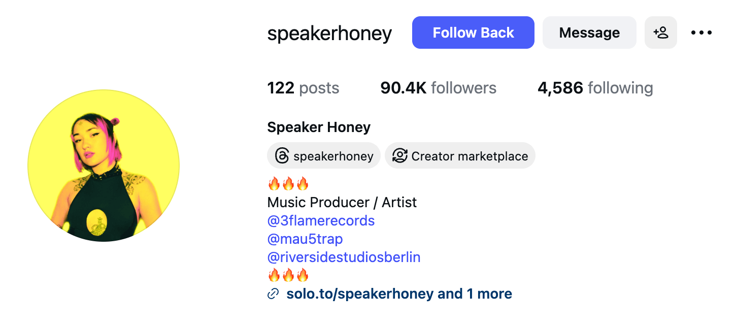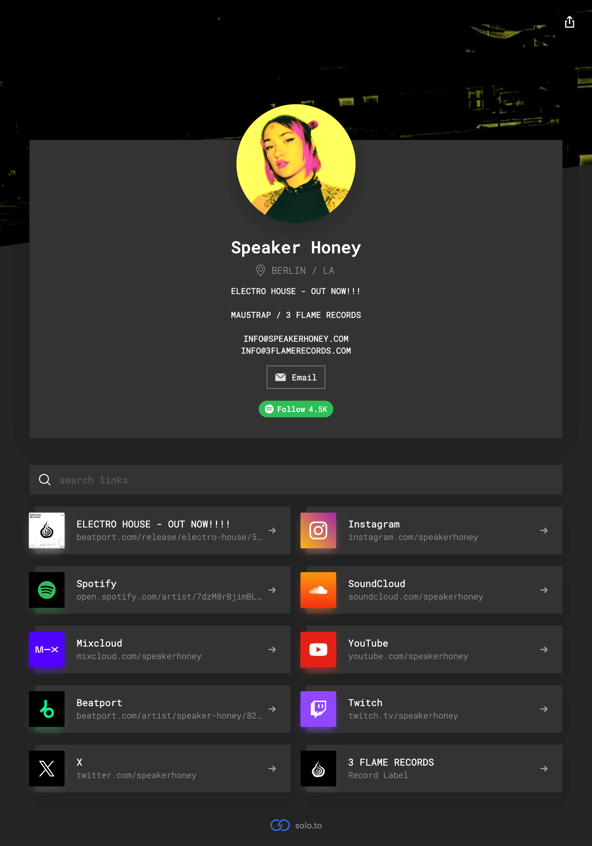 An example is SpeakerHoney, a music producer and artist. She used solo.to to create her link-in-bio page, which included all her socials, Spotify profile, contact details and much more. See the page below: