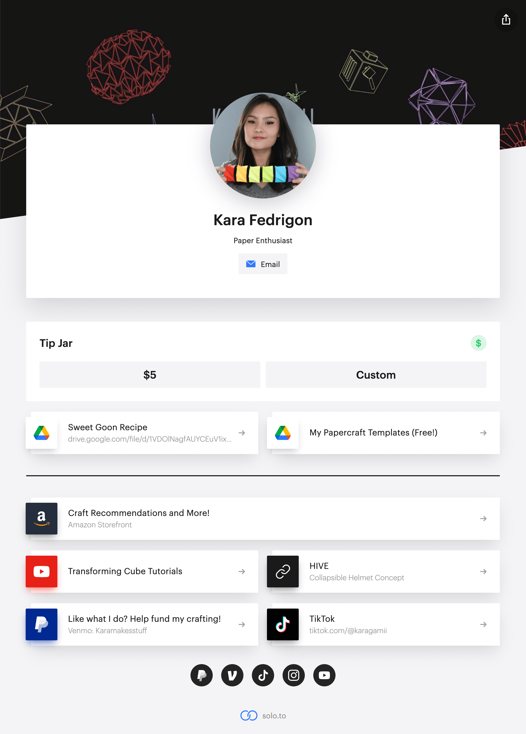 A better inspiration? You can replicate Kara Fedrigon’s approach by placing a custom tip jar on your page via solo.to's integrated system.